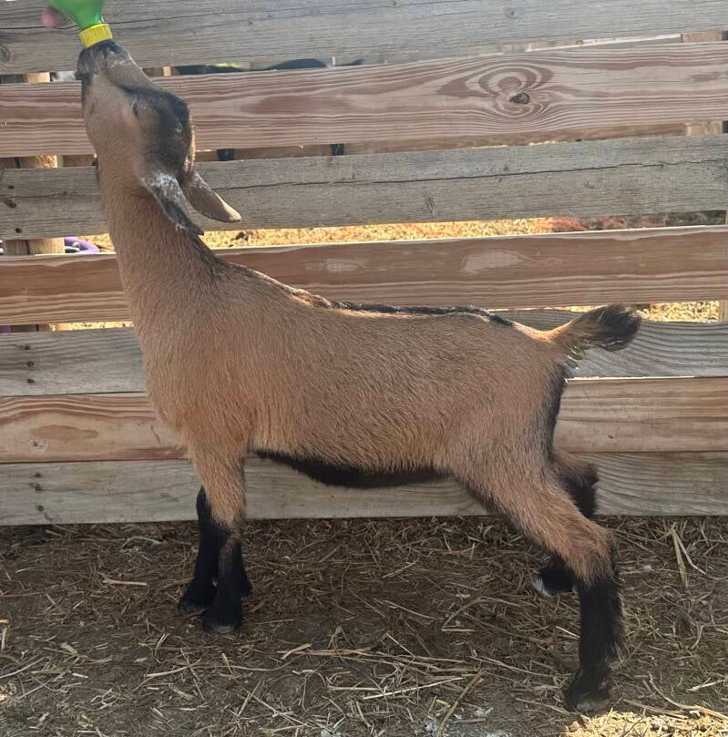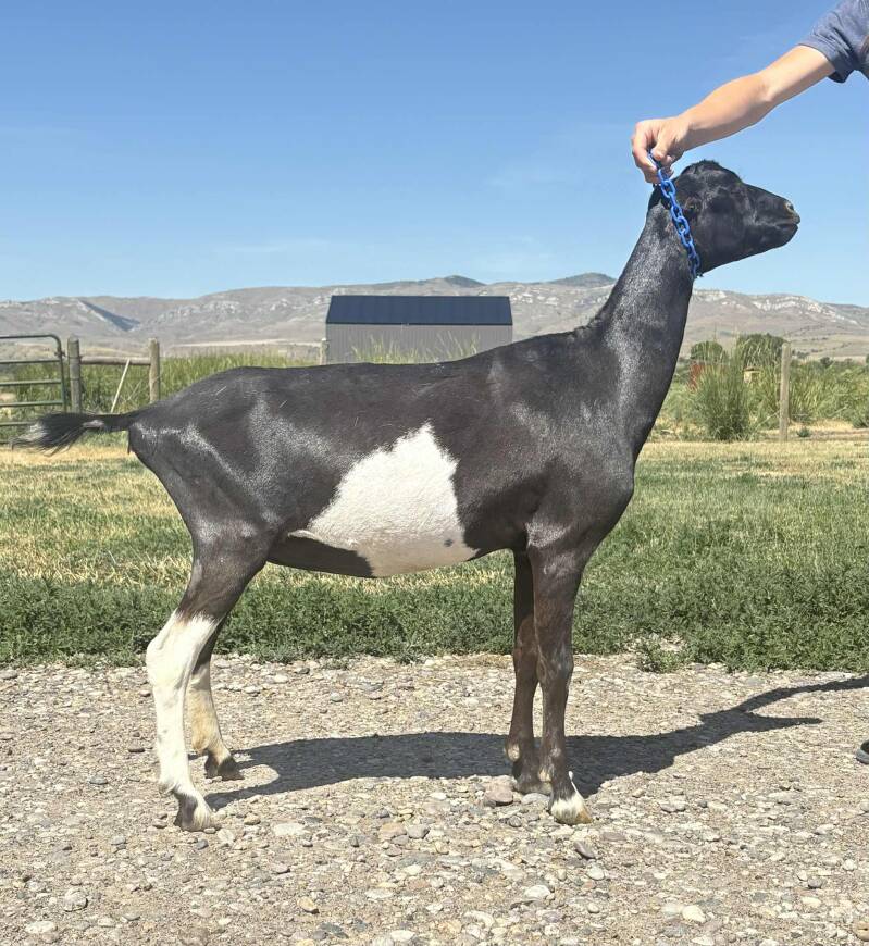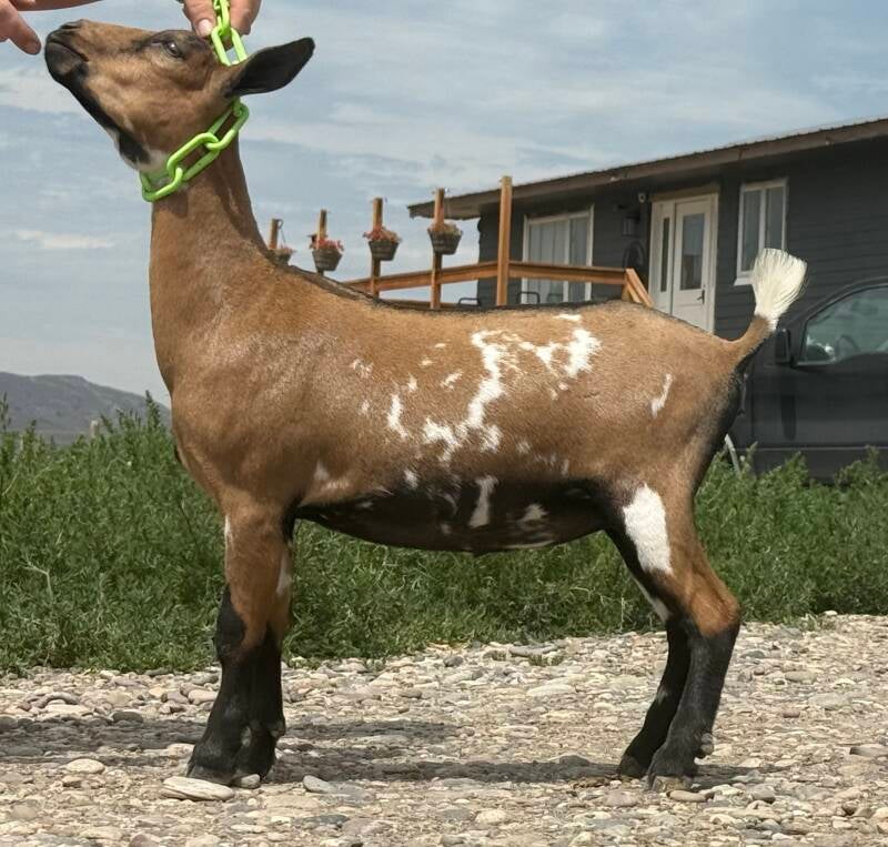 Little May got a bit of a late start. She was born later than the rest of the kids and her dam had some mastitis issues at freshening. She was small for some time and we very seriously considered letting her go, we even offered her to a few people. Lucky for us no one snatched her up. She is growing into a beautiful young doe that we are happy to move on to our keeper list. Some thing’s happen for a reason and I guess little May is one of those things. Due to her breeding herd dispersing prior to her birth, unfortunately she didn’t get a herd name. But don’t be fooled, Herd name or not, she has some awesome genetics!