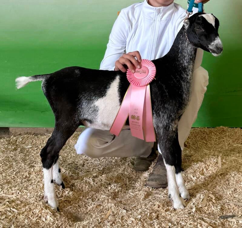 Angel is another awesome product of a Kentucky Bourbon AI breeding. This little moonspoted, blue eyed, beauty should mature into an amazingly productive and competitive doe! Even if she does have great big opinions….